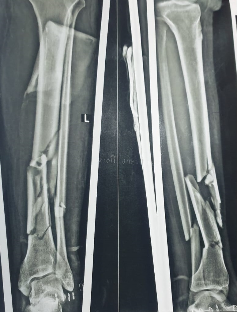Radiological evaluation revealed multiple fracture segments in the midshaft region with loss of structural continuity. The Samay Surgical Pvt. Ltd.’s Expert Tibia Nail was chosen for its high mechanical strength and ability to support complex shaft injuries effectively.