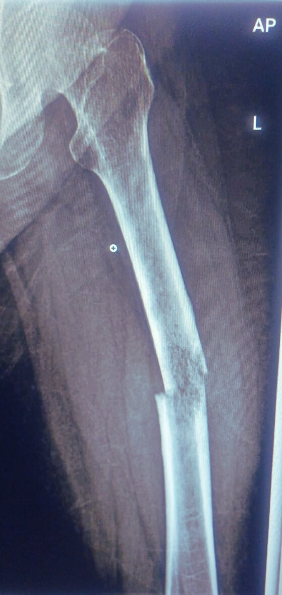 She arrived with severe pain in the mid-thigh region after trauma and was unable to bear weight on her right leg. Examination revealed noticeable swelling along the femoral shaft, marked tenderness, and clear instability at the fracture site. Her limb appeared slightly shortened with external rotation, and even small movements caused sharp pain. These findings were strongly suggestive of a Diaphyseal Segment Femur Simple Transverse Fracture.