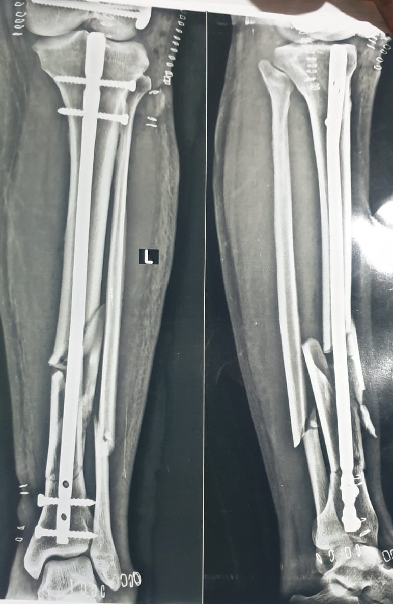 The patient was monitored for swelling, pain, and circulation, with early physiotherapy started to maintain joint movement. Weight-bearing was introduced in stages as healing progressed and X-rays confirmed stable fixation around the Expert Tibia Nail. Overall recovery remained smooth, with steady improvements in mobility and comfort.